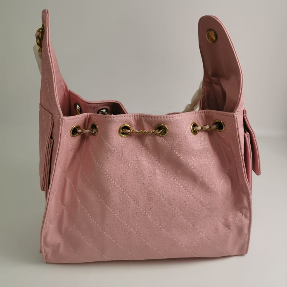 This iconic Chanel bag is a timeless piece of luxury, designed with quilted leather and a signature gold-tone chain strap. Featuring a stylish drawstring closure, it offers a perfect balance of elegance and functionality. Ideal for both day-to-night wear, this bag adds a chic, refined touch to any outfit. Enhance your collection with this classic piece that blends beauty, craftsmanship, and practicality.