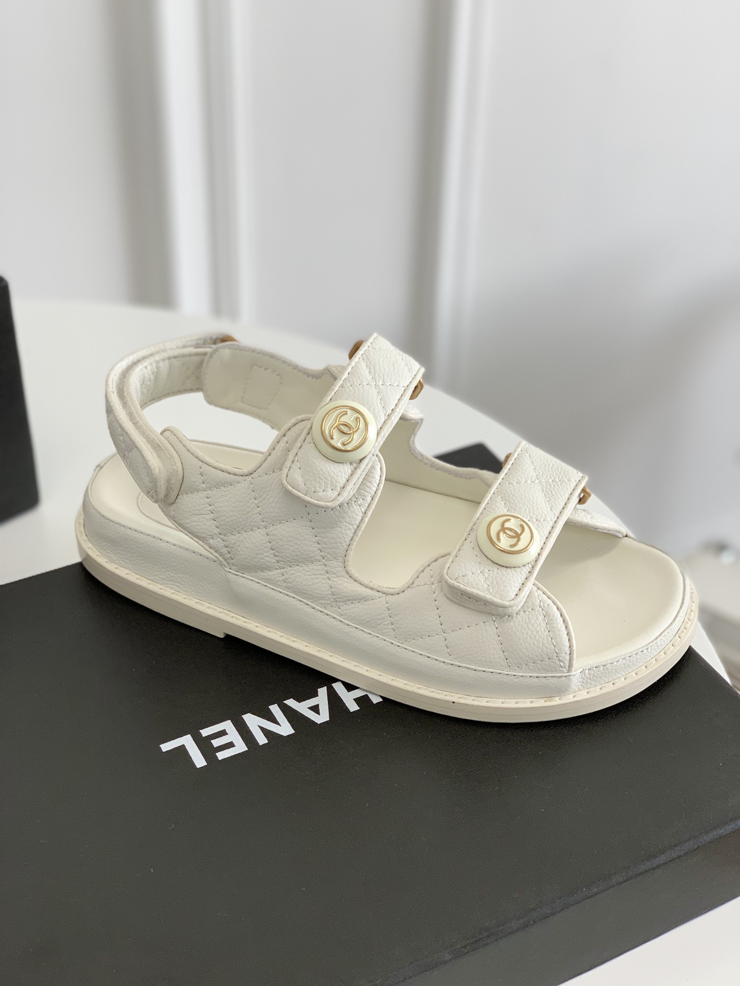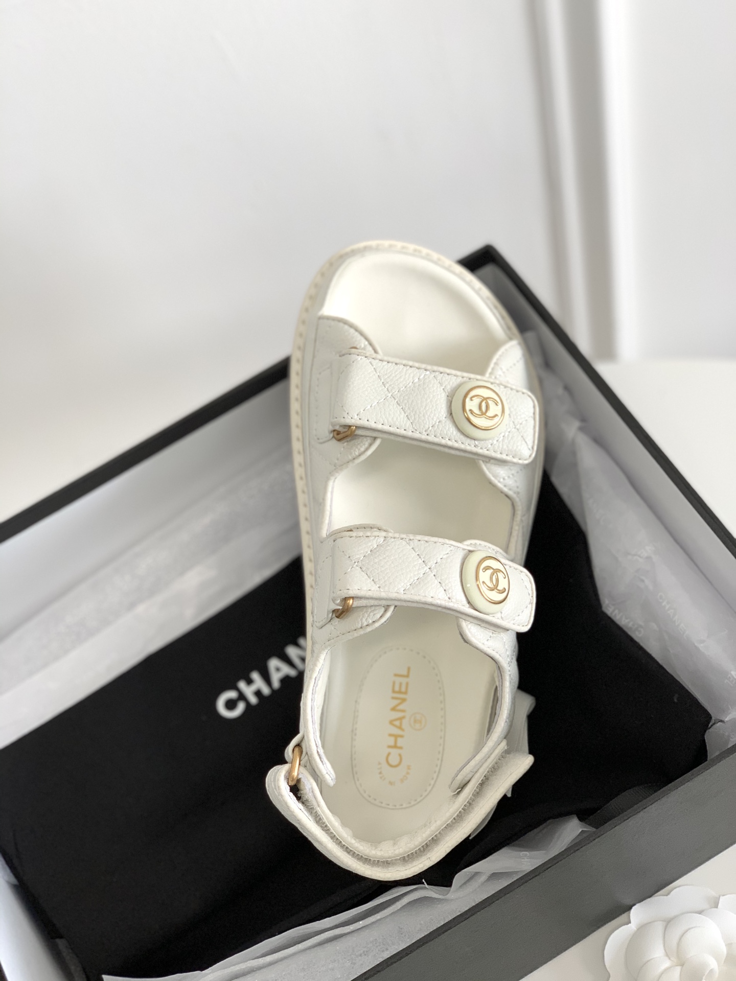 - These chic flats from Chanel feature velcro straps and the CC logo.