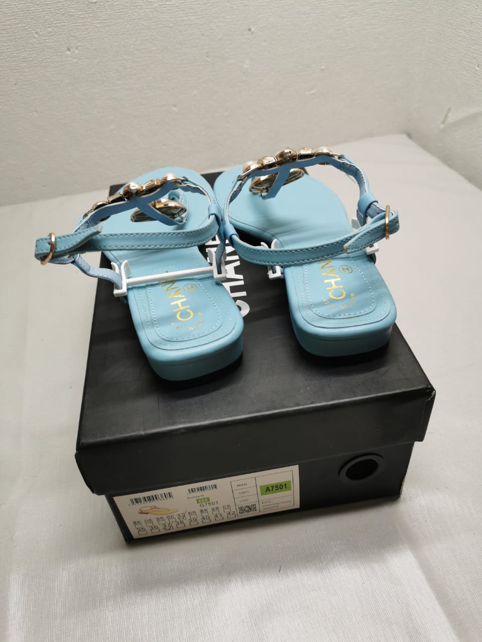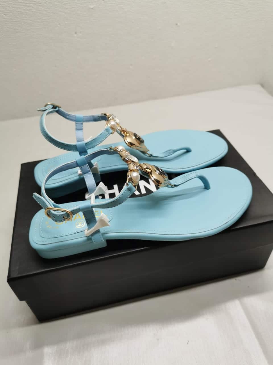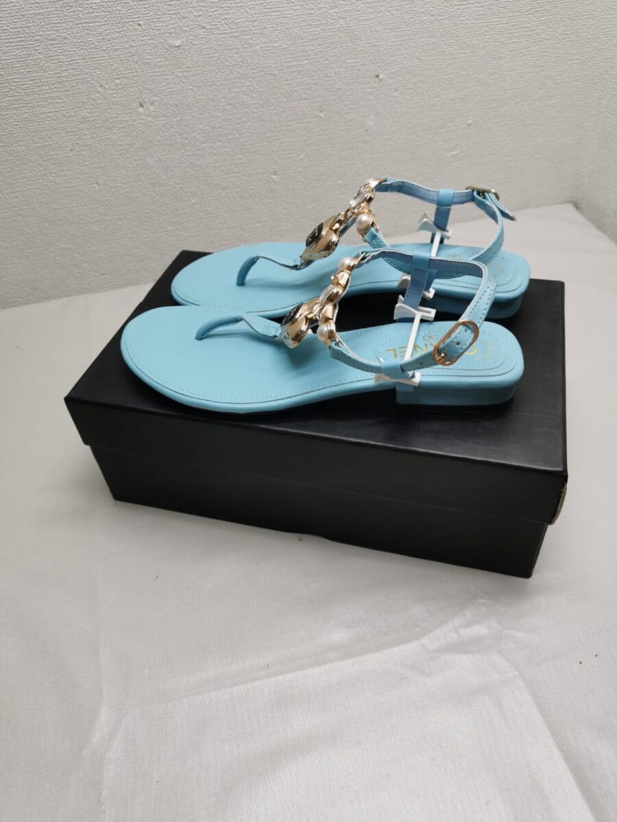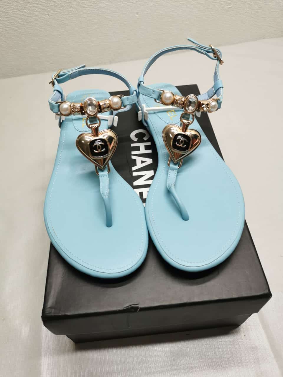 Chanel Shiny Pearl Crystal Cc Heart Thong Sandals Light Blue