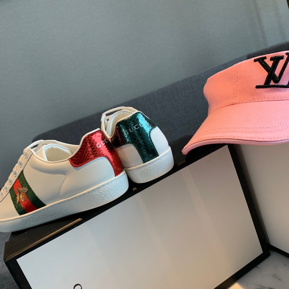 - White leather with red leather detail on the heel of one shoe and green on the other