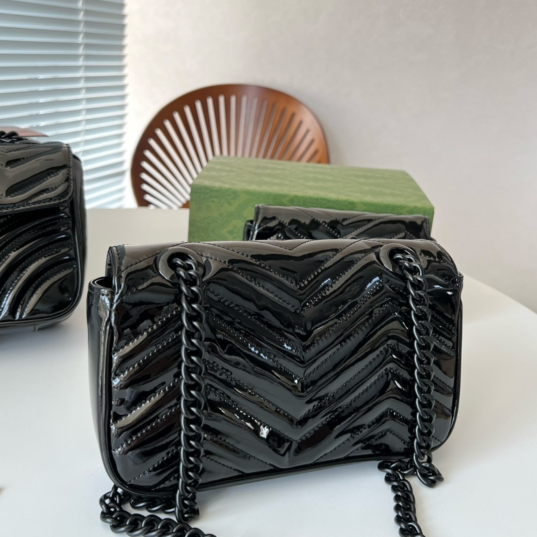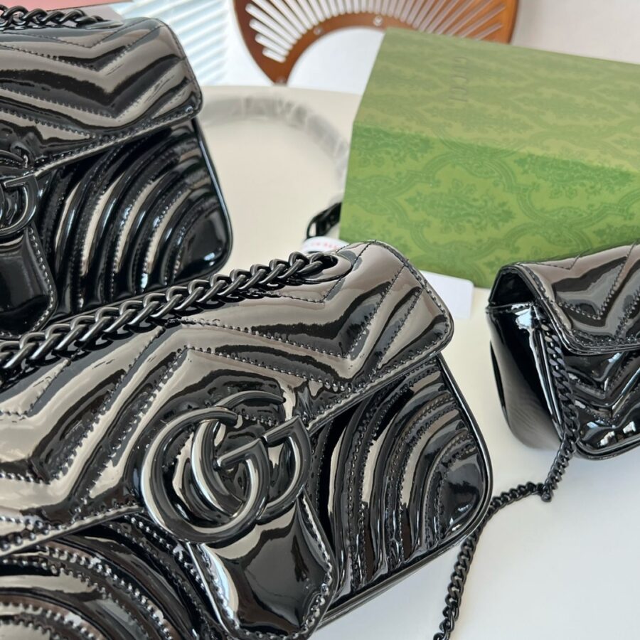 Elevate your accessory game with this sleek and timeless GG Marmont bag from Gucci. Crafted from luxurious black patent leather, the signature chevron pattern and iconic GG hardware make a bold statement. The delicate chain strap allows for versatile styling, whether carried on the shoulder or crossbody. Perfect for those who seek modern elegance with a touch of sophistication, this bag adds an air of understated luxury to any ensemble.