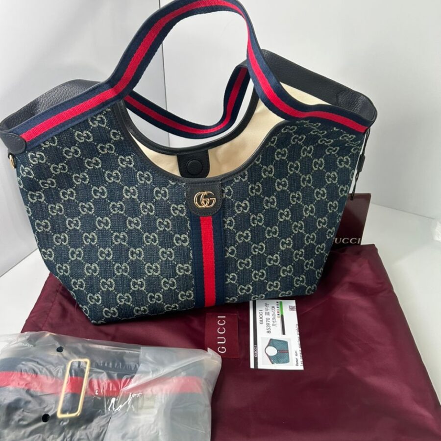 Introducing the small Gucci Giglio: first unveiled at the Cruise 2026 fashion show in Florence, it is presented here in a versatile size. The design pays tribute to the House’s Italian roots, and the spirit of continuity and reinvention. Crafted in GG denim, this capacious bag features the Web trim, and is complete with a detachable pouch. Measurements: 25 x 20 x 15 cm / 9.8 x 7.9 x 5.9 inches