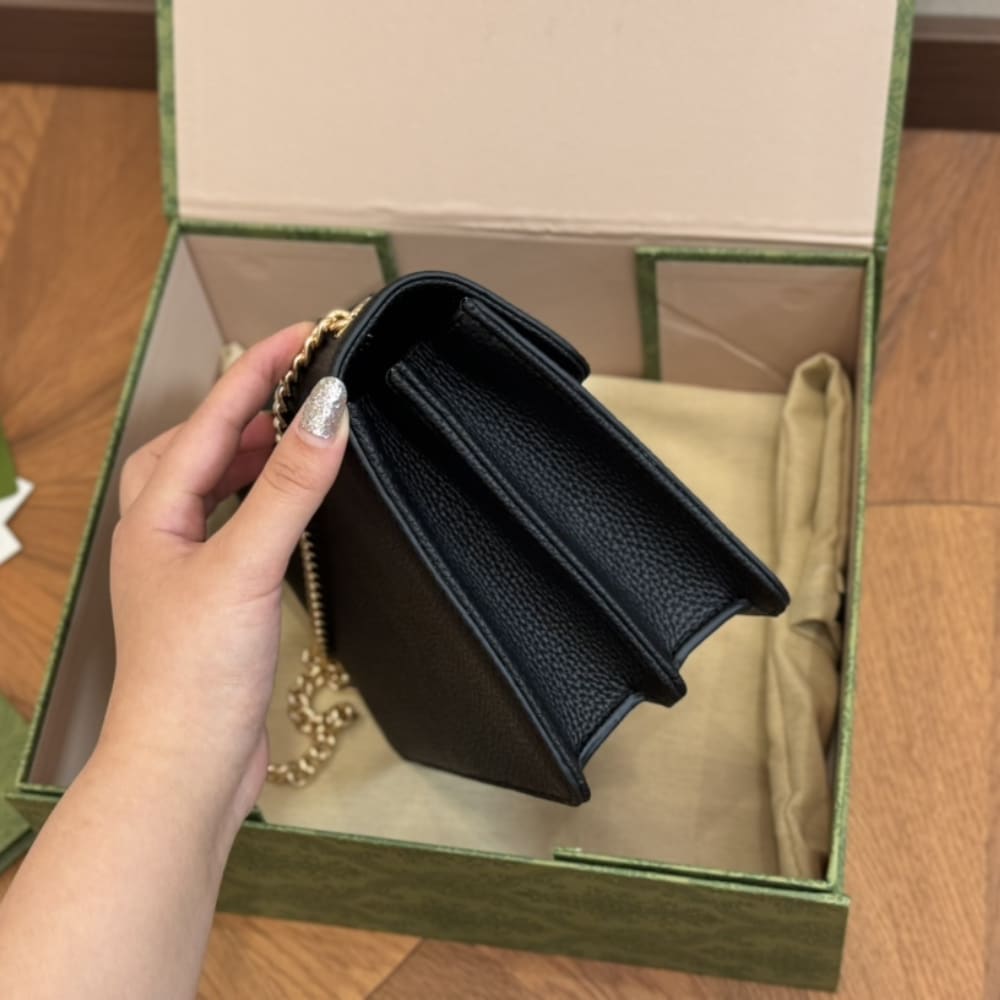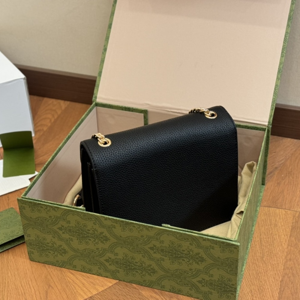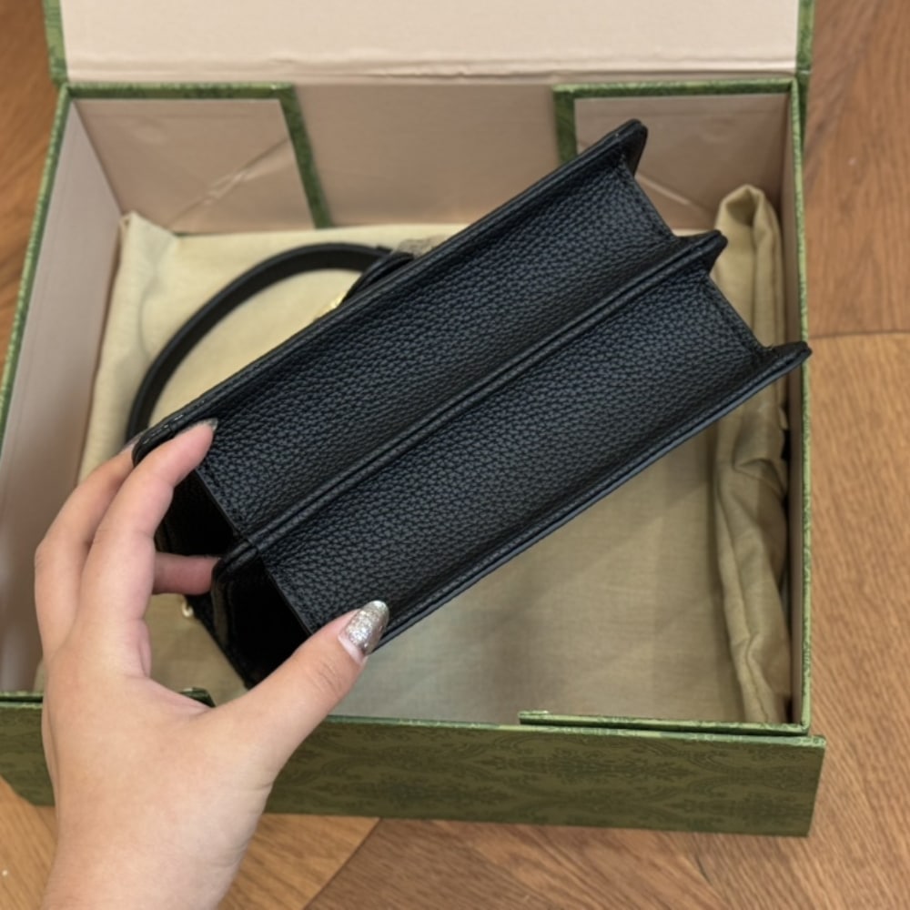 - The closure features gold-toned hardware with two interlocking “G” letters, creating a striking highlight.