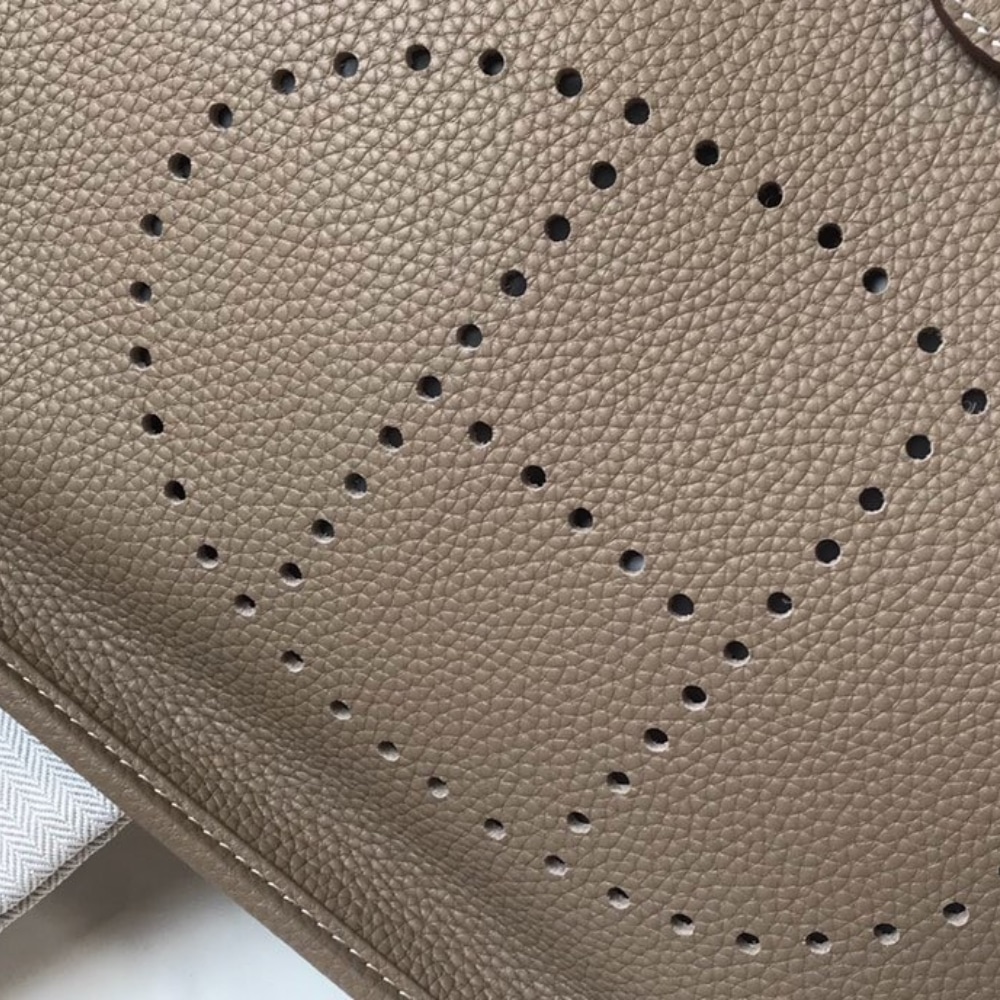 The Hermes Evelyne III 29 Bag in Etoupe is a crossbody icon crafted from supple, grained leather. It features the signature perforated “H” logo on the front and a simple leather tab closure for a minimalist, sporty aesthetic. Designed for practical luxury, it includes a matching removable canvas shoulder strap and a functional rear exterior pocket, perfect for effortless daily carry.