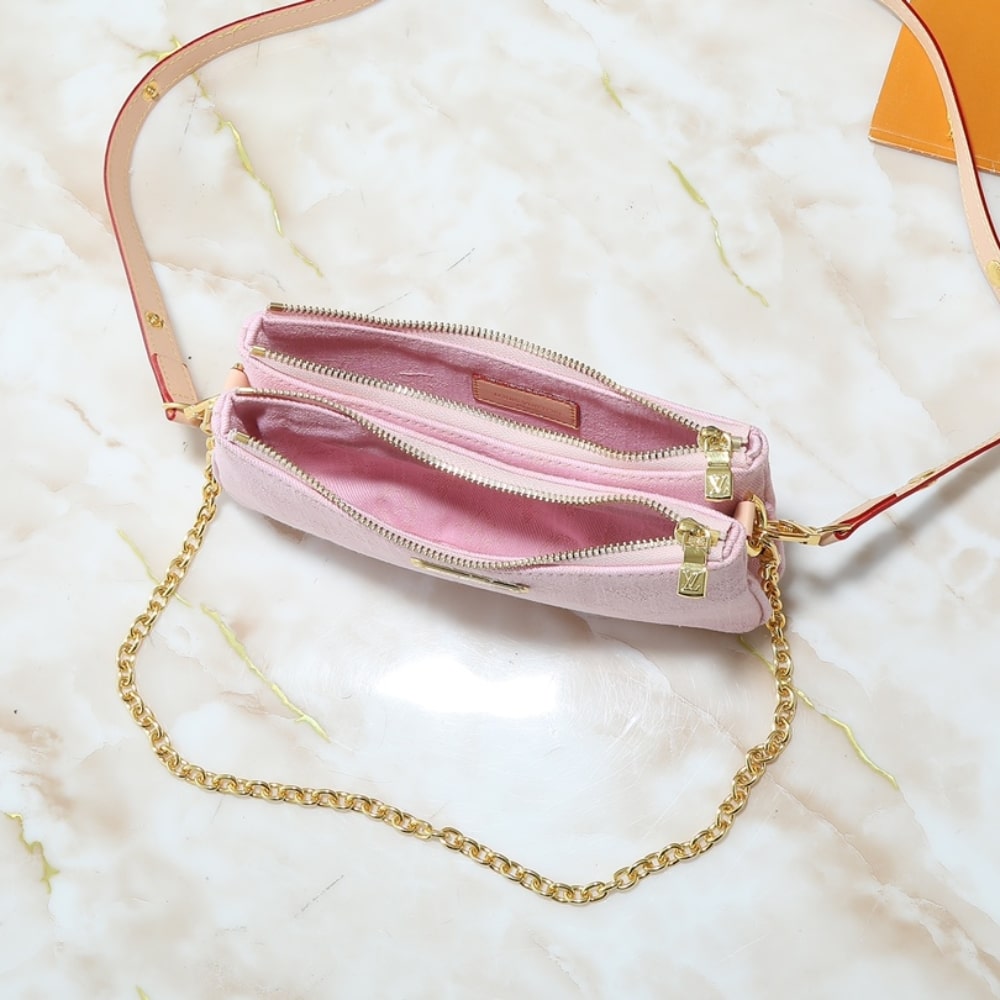 This seasonal edition of the Pochette Liv showcases Louis Vuitton’s iconic Monogram Denim in a chic Washed Pink palette that lends a hint of vintage appeal. Designed to fit snugly under the arm, it is fitted with a detachable light gold-toned chain, plus a removable, adjustable strap for multiple styling options.