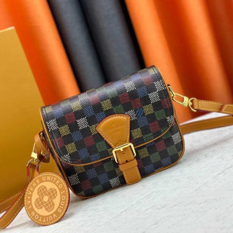 Pharrell Williams brings his color palette to this Montsouris Messenger PM with his LV Vers Damier Ebene canvas. Multicolored checks, are printed on top of the classic Damier Ebene pattern. This motif, combined with the detachable LV Vers UNITED bag tag in the shape of a globe, gives this bag a heritage feel.