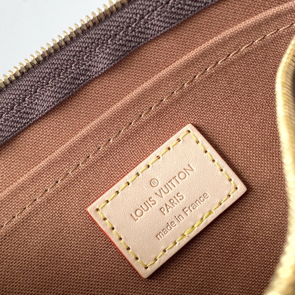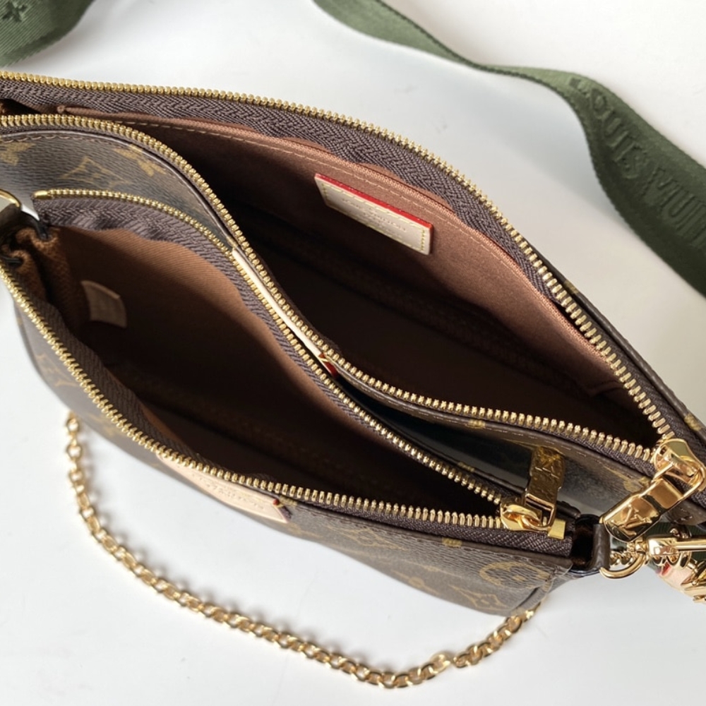The Multi Pochette Accessoires is a hybrid cross-body bag with multiple pockets and compartments that brings together a Pochette Accessoires, a Mini Pochette Accessoires and a Round Coin Purse. Fashioned from Monogram canvas with a mini Monogram pattern on the sides of the two pochettes, it has both a removable gold-tone chain and an adjustable Louis Vuitton inscribed Jacquard strap for multiple carrying options.