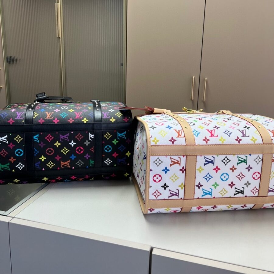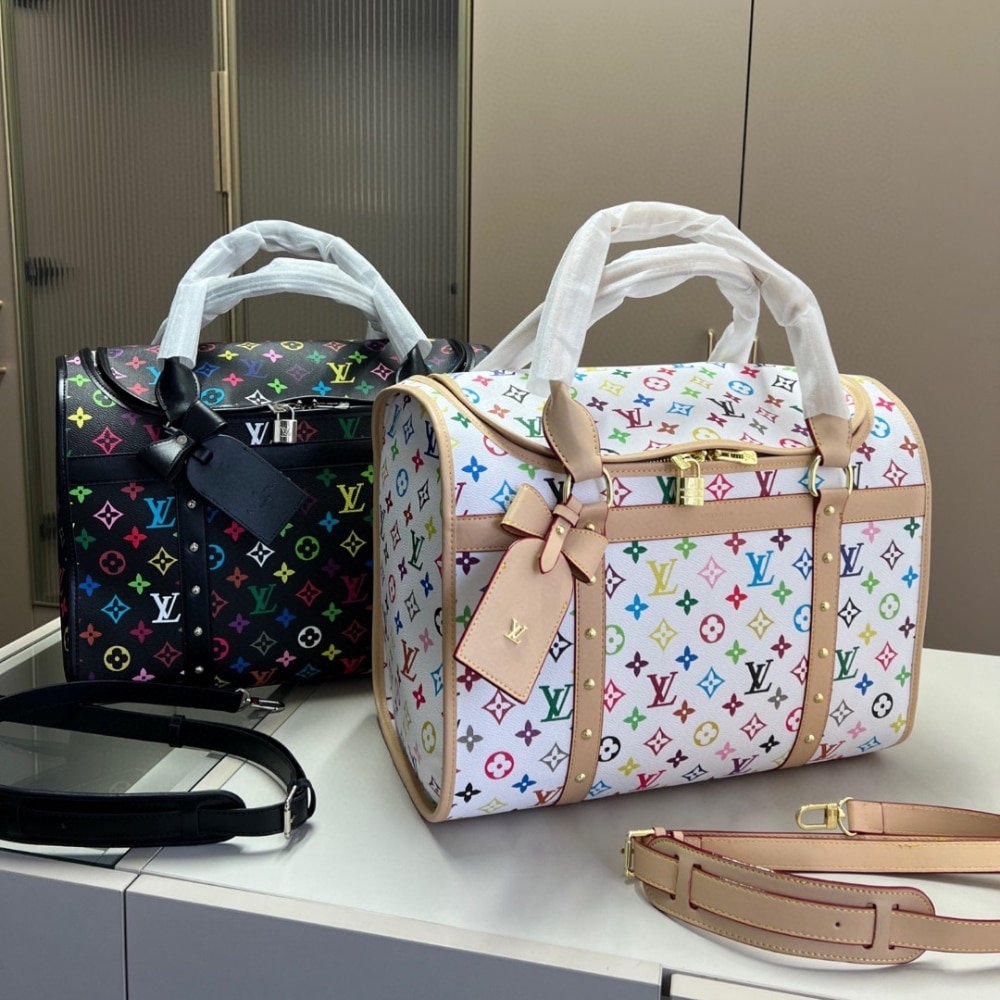 Louis Vuitton x Takashi Murakami Dog Bag Multicolore Blanc 40Cm M13741 features a spacious, structured silhouette crafted from signature monogram canvas, highlighted by Murakami’s iconic multicolor artwork on a clean white base. Designed for stylish travel with pets, it offers a functional interior with breathable detailing and secure closures. A rare, collectible piece that blends playful artistry with Louis Vuitton’s heritage craftsmanship.