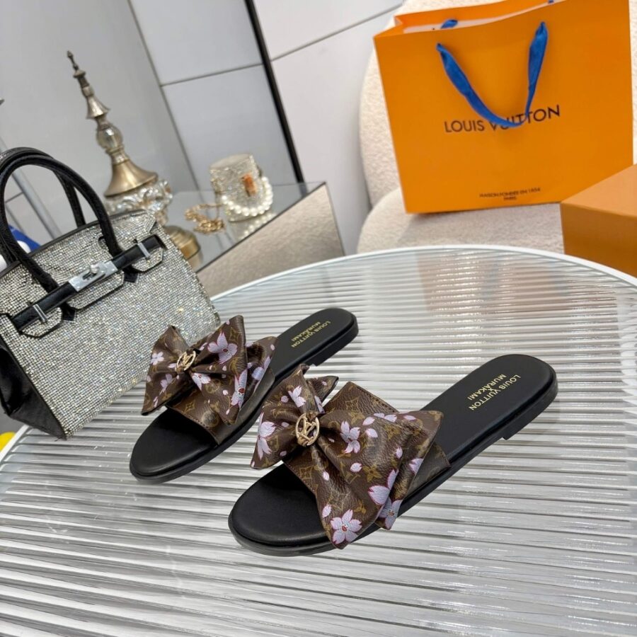 Crafted in an understated slip-on shape, the Lily flat mule makes a playful statement with an oversized bow detail on the upper complete with golden LV Circle hardware. Crafted from the House’s classic Monogram coated canvas, vibrant Cherry Blossom motifs from the re-edition of the Louis Vuitton x Takashi Murakami collection introduce a joyful burst of color in the renowned Japanese artist’s signature playful style.