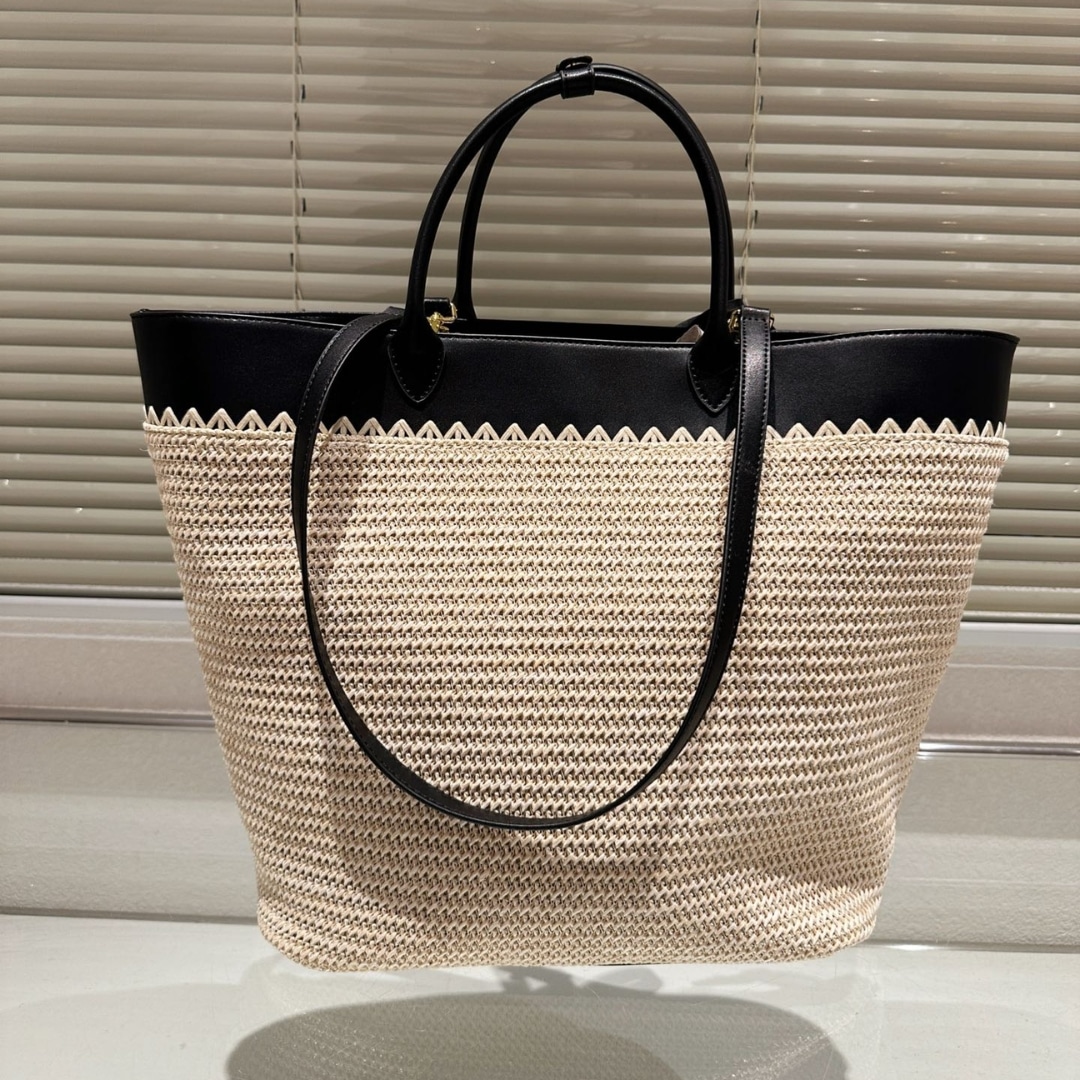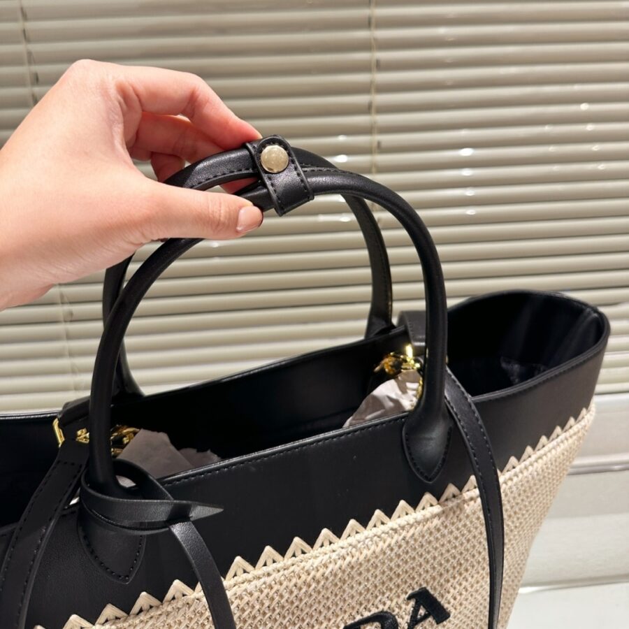 Prada Crochet And Leather Tote Bag Tan And Black 33Cm 1Bg499 2M2Q F0I55 V Goo