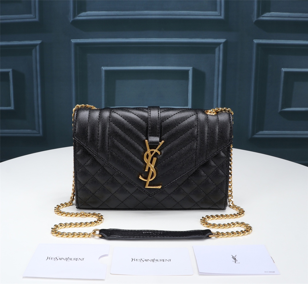 Saint Laurent Envelope Small In Quilted Grain De Poudre Embossed Leather Gold Black 600195BOW911000 / 21cm / 8.2 Inches