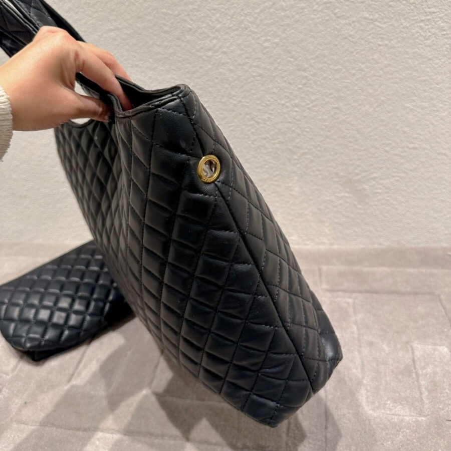 Shopping bag with toggle closure, featuring a removable zipped pouch, decorated with carré-quilted overstitching and the new sculpted jewel CASSANDRE.