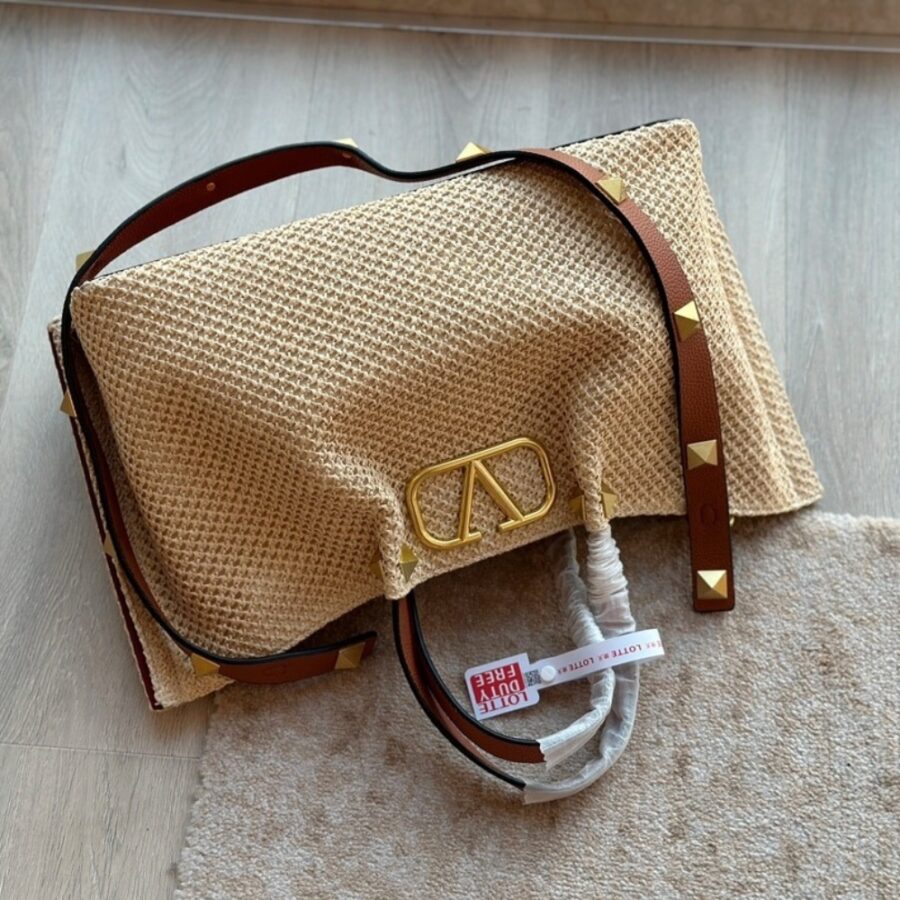 Valentino Garavani medium straw Summer Tote bag featuring a metallic VLogo Signature and red leather detail on the sides. The shoulder strap features the iconic maxi studs.